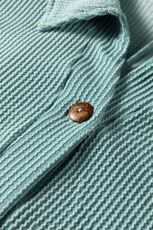This top is your go-to for effortless cool. The twist ribbed texture adds a fun, unique vibe, while the relaxed fit keeps things comfy and modern. The sleeves design to switch up your look from laid-back to lively, and the classic button placket brings just the right touch of style with easy wearability. Perfect for days when you want to feel playful and polished all at once! Polyester/Viscose/Spandex