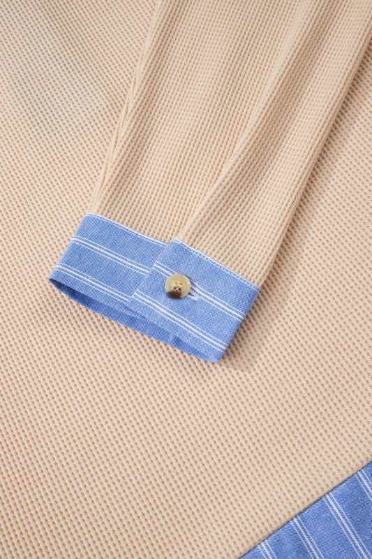 This plus-size top combines textural interest with thoughtful design details. The fabric pairs beautifully with contrast striped patchwork, while a collared split neckline and button accents add polish. Dropped shoulders create an effortlessly relaxed silhouette, complemented by buttoned cuffs and strategic side slits. The curved high-low hem elevates the casual aesthetic, making this piece versatile enough for layering or wearing solo. Perfect for those seeking comfort without compromising on style. Polyester/Cotton