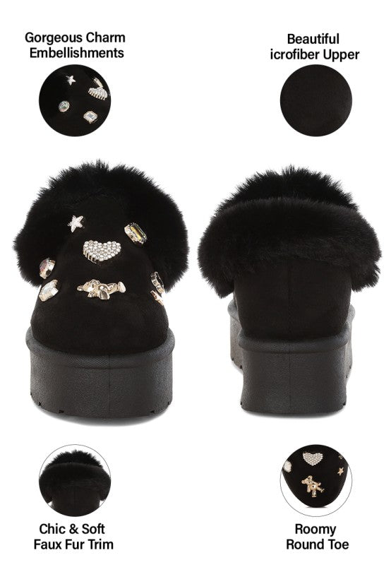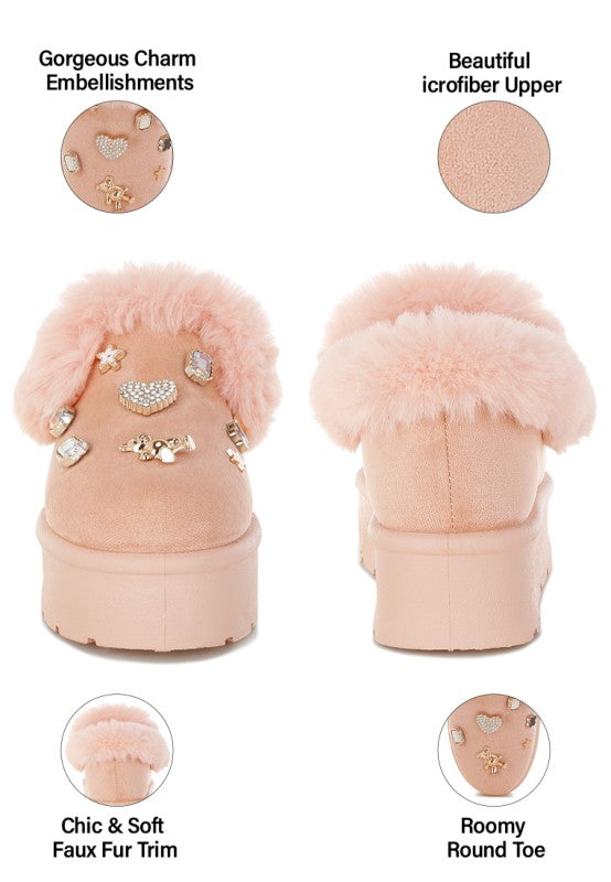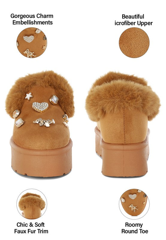 The slip on snow boots are the coziest pair you'll own with the soft faux fur collar. The cute little charms detail elevate the visual aesthetic and gives the footwear an adorable and chic aesthetic which is very appealing. The soft cushion insoles cut strain while the slip on design gives them an easy to wear feature.