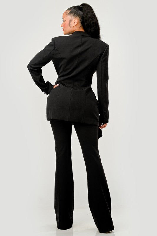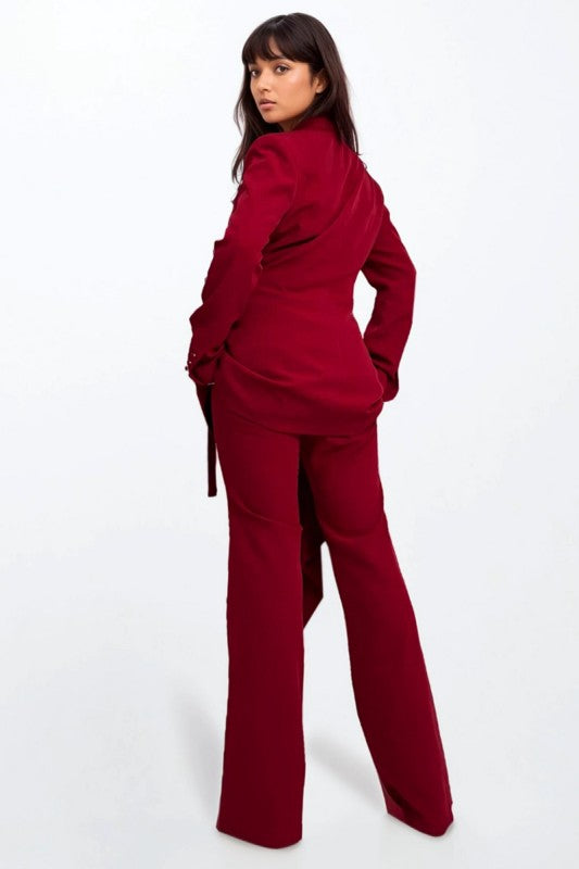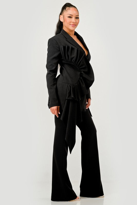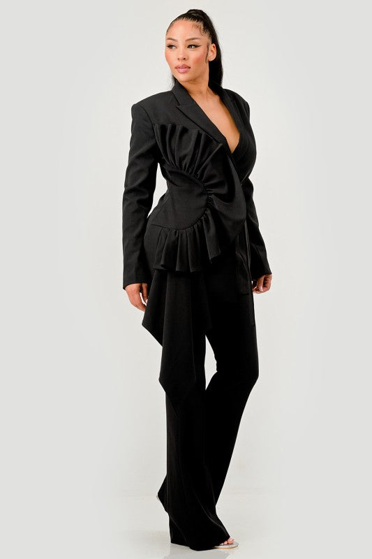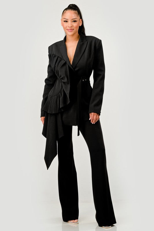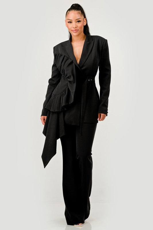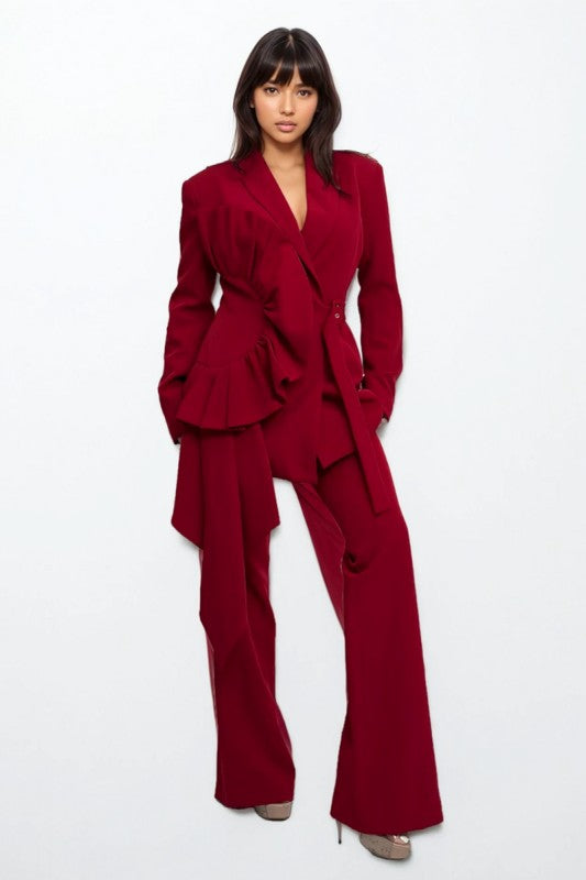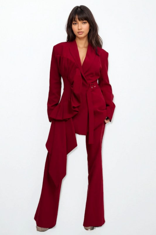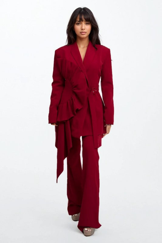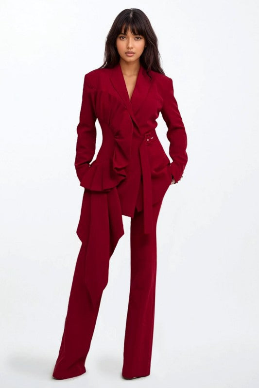 Command the room in the Ethereal Elegance Set, a perfect blend of structure and sophistication. This two-piece ensemble features a tailored blazer with an asymmetrical ruched detail and cascading ruffle for a striking, feminine silhouette. The belt cinches at the waist to accentuate your figure, while the high-waisted wide-leg trousers add a sleek and polished finish. Crafted in a luxurious cream hue, this set is your go-to for upscale events, business gatherings, or when you want to make an unforgettable statement. Pair with strappy heels and minimal accessories to let the outfit speak for itself.