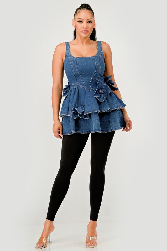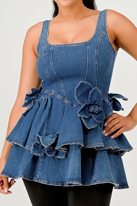 This denim peplum top is designed with a square neckline and fitted bodice for a flattering shape. The layered ruffle tiers create a playful silhouette while the side 3D floral appliques add a feminine touch. Made in a medium wash denim that is versatile and easy to style. Perfect to pair with leggings, jeans, or skirts for both casual and elevated looks.